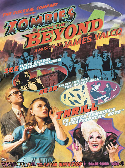 A bevy of flying saucers from Planet X has appeared over the skies of Beertown, led by alien aviatrix Queen Zombina, on a quest to “zombify” and abduct all of Earth’s men! The Milwaukee Space Center and the US military are prepared to meet the foes head on, until Zombina unleashes her secret weapon. It’s up to a mild-mannered scientist, an all-American girl-next-door, a man-hungry secretary and one plucky, tap-dancing delivery boy to save the world from this planetary menace from outer space!